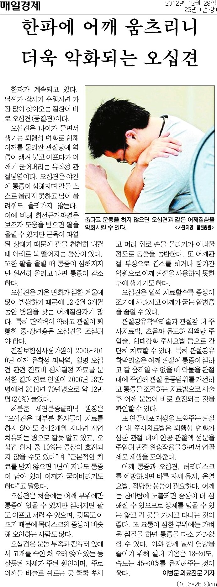 ■ 보도매체 : 매일경제 ■ 보도기사 : 한파에 어깨 움츠리니 더욱 악화되는 오십견 ■ 보도일자 : 20...