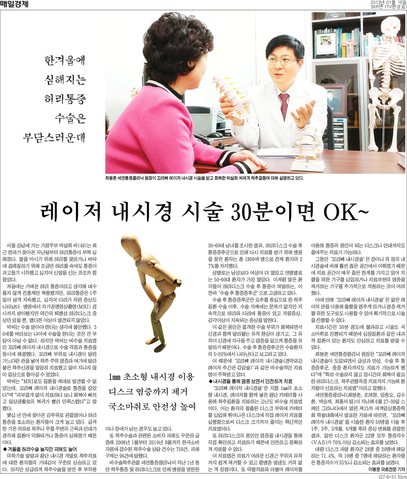 ■ 보도매체 : 매일경제 ■ 보도기사 : 한겨울에 심해지는 허리통증 수술은 부담스러운데 ■ 보도일자 : ...