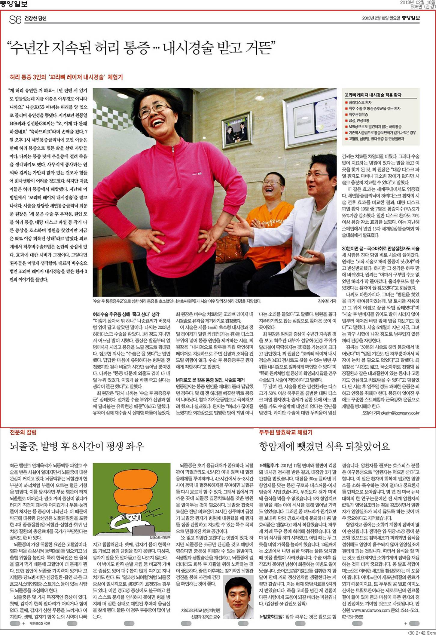 ■ 보도매체 : 중앙일보 ■ 보도기사 : “수년간 지속된 허리 통증…내시경술 받고 거뜬” ■ 보도일자 :...