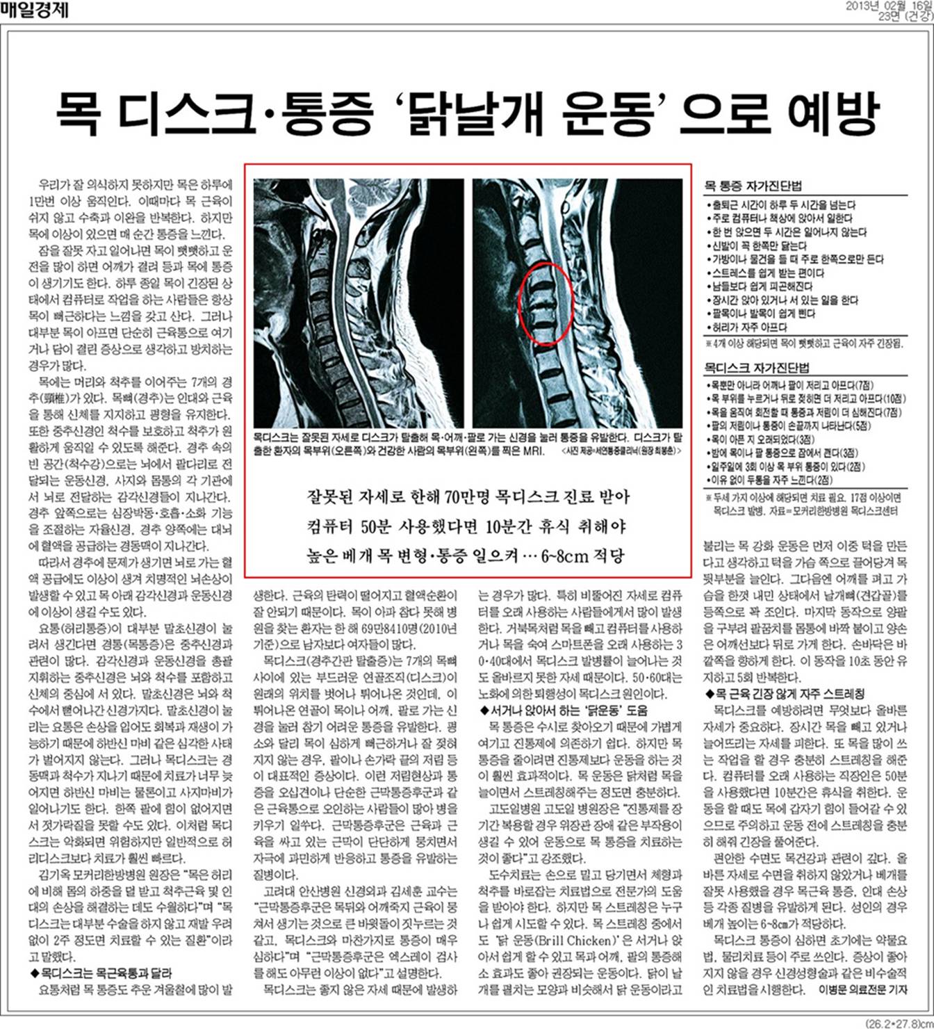 ■ 보도매체 : 매일경제 ■ 보도기사 : 목 디스크·통증 `닭날개 운동`으로 예방 ■ 보도일자 : 201...